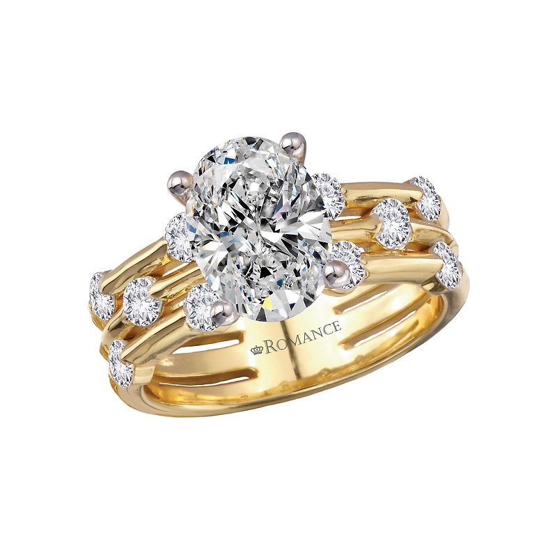 Semi-mount engagement ring with diamonds stationed along a 3-row band crafted in 14kt yellow gold and a center setting that will accommodate an 10x7mm oval shaped stone. (D 3/4 carat total weight). This is a semi-mount, No Center Stone included.