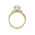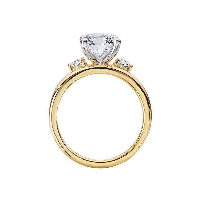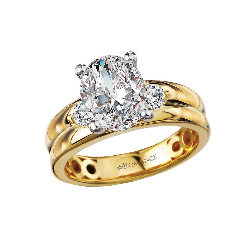 14kt yellow gold double domed band with two round diamonds on either side of a center setting that will accommodate a 9.5x7.5mm oval shaped diamond. (D 1/4 carat total weight). This is a semi-mount, No Center Stone included.