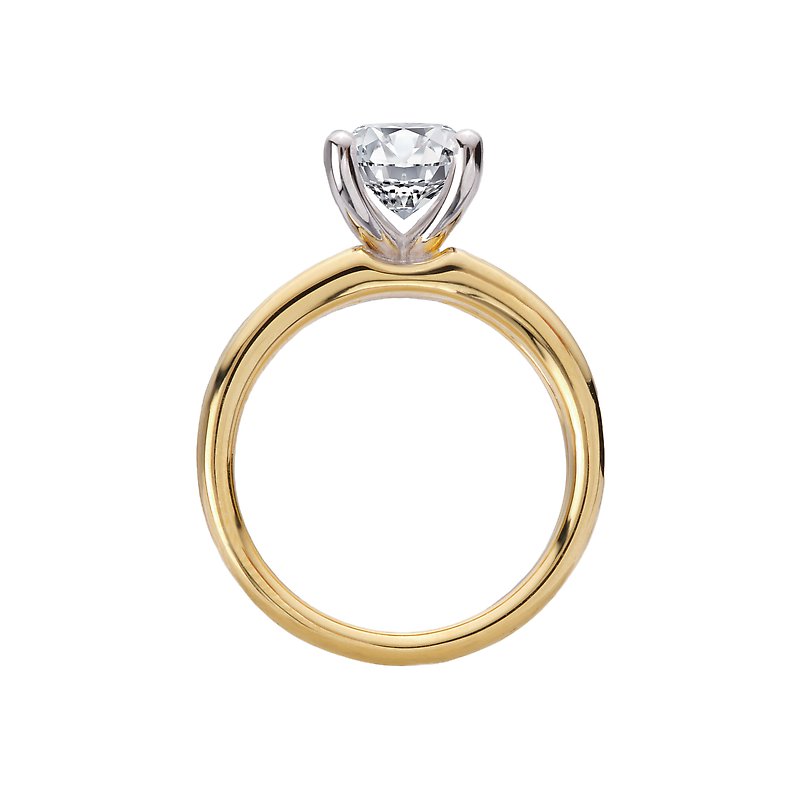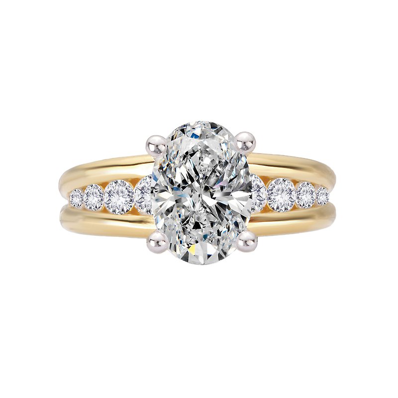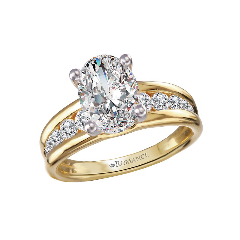 14kt yellow gold semi-mount engagement ring with graduated sized round diamonds channel set on either side of a center setting that will accommodate a 10x7mm oval shaped diamond. (D 1/5 carat total weight). This is a semi-mount, No Center Stone included.