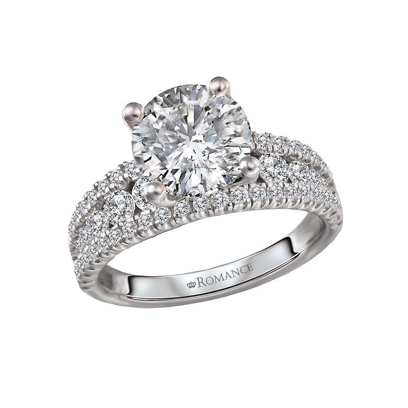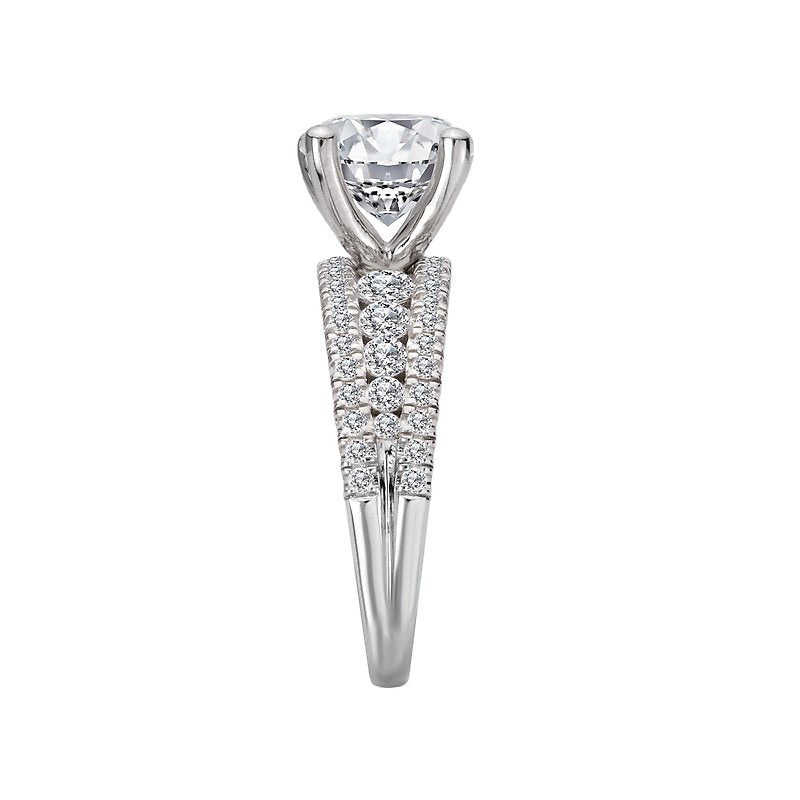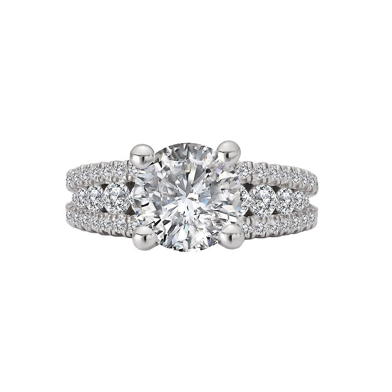 14kt white gold semi-mount engagement ring with a center row of round diamonds set inbetween two rows of smaller round diamonds on either side of a center setting that will accommodate a 8.2mm round diamond. (3/4 carat total weight). This is a semi-mount, No Center Stone included.