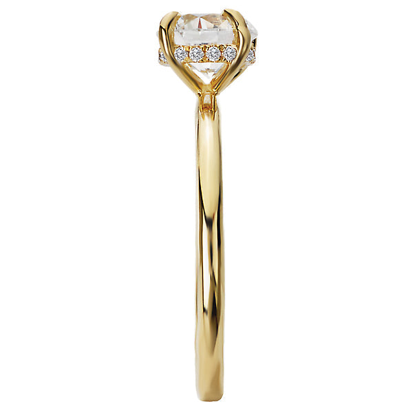 Lab Grown Diamond This 14kt yellow gold semi-mount engagement ring has a hidden halo of diamonds underneath a center setting that will accommodate a 6.5mm round diamond. (D .06 carat total weight)