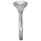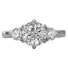 Dazzling six prong setting engagement ring is surrounded by two brilliant cut 1/5 round diamonds all set in high polished 14kt white gold. This semi mount ring will accommodate a round 7.4mm diamond or gemstone to complete this 3-stone look.