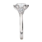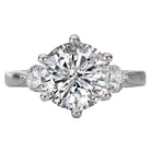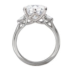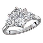 Dazzling six prong setting engagement ring is surrounded by two brilliant cut 1/5 round diamonds all set in high polished 14kt white gold. This semi mount ring will accommodate a round 9.0mm diamond or gemstone to complete this 3-stone look.