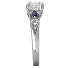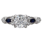 This expertly hand-crafted 14kt white gold ring accented with milgrain detail, displays brilliant cut sapphires and round diamonds surrounding the center claw prong setting that will accommodate a round 6.5mm diamond (D .09 carat weight; S 1/5 carat weight)
