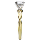 This elegant semi-mount engagement ring features a twisted shank of 14kt yellow gold on either side of a hidden halo of sparkling diamonds that wrap around a 14kt white gold peg head center setting that will accommodate a 6.5mm round diamond. (D .04 carat total weight)