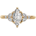 This beautiful 14kt yellow gold semi-mount engagement ring has a trio of marquise and round diamonds on either side of a setting that will accommodate a 10 x 5mm marquise shaped diamond. (D 1/5 carat total weight)