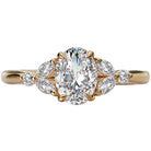 This beautiful 14kt yellow gold semi-mount engagement ring has a trio of marquise and round diamonds on either side of a setting that will accommodate a 7.5 x 5.5mm oval shaped diamond. (D 1/5 carat total weight)