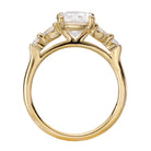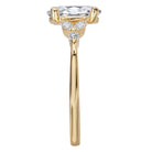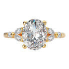 This beautiful 14kt yellow gold semi-mount engagement ring has a trio of marquise and round diamonds on either side of a setting that will accommodate a 9.5mm x 7.5mm oval shaped diamond. (D 1/5 carat total weight)
