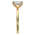 This 14kt yellow gold semi-mount engagement ring has a hidden halo of diamonds underneath a center setting that will accommodate a 7x5mm emerald cut diamond. (D .06 carat total weight)