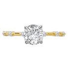 This unique 14kt yellow gold semi-mount engagement ring has round diamonds spaced widely along the band on either side of a center setting that will accommodate a 6.5mm round diamond. (D 1/8 carat total weight)