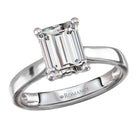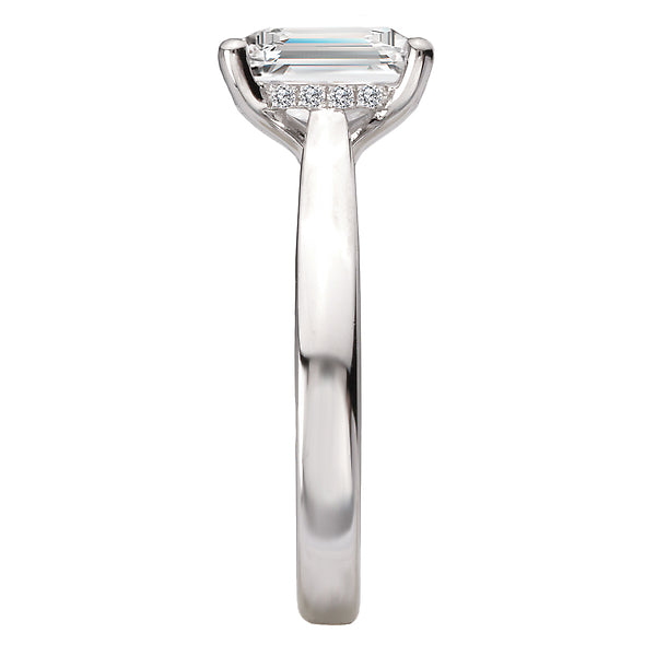 14kt white gold semi-mount engagement ring with a hidden halo of round diamonds under a center setting that will accommodate a 8.5 x 6.5mm emerald cut diamond. (D .08 carat total weight)