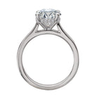 High polished 14kt white gold engagement ring with a bold shank and a hidden halo of diamonds under a center setting that will accommodate a 8.2mm round diamond. (D .08 carat total weight)