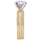 14kt yellow gold semi-mount engagement ring with a split shank that is lined with round diamonds on either side of a center setting that will accommodate a 8.2mm round diamond. (D 1/5 carat total weight)