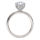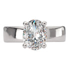 14kt white gold bold band and a hidden halo of round diamonds under a center setting that will accommodate a 9.5x7.5mm oval shaped diamond. (D 1/7 carat total weight)