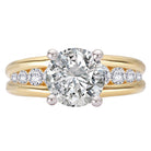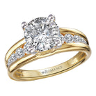 14kt yellow gold semi-mount engagement ring with graduated sized round diamonds channel set on either side of a center setting that will accommodate a 8.3mm round diamond. (D 1/5 carat total weight)
