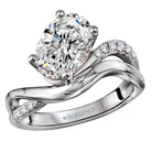 14kt white gold semi-mount engagement ring with a wavy shank accented with round diamonds on either side of a center setting that will accommodate a 10x7mm oval shaped diamond. (D 1/10 carat total weight)