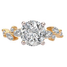 14kt yellow gold semi-mount engagement ring with round and marquise shaped diamonds adorning the shank on either side of a center setting that will accommodate an 8.3mm round diamond. (D 1/2 carat total weight)