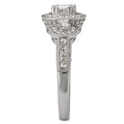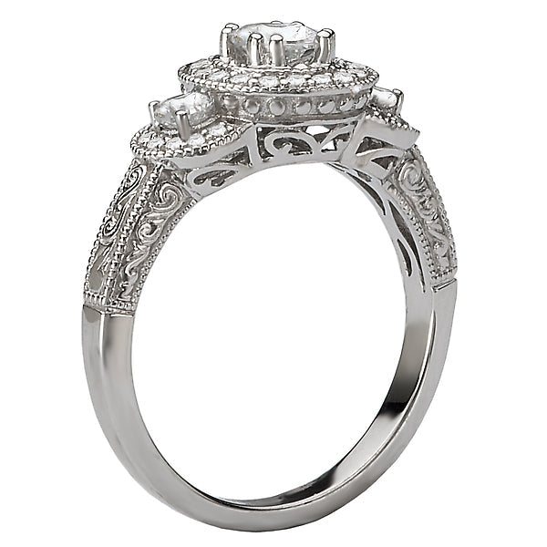 This engagement ring created in 14k white gold features triple halos of sparkling diamonds surrounding the center stone accented with milgrain and engraving detail. (D 1/3 carat total weight) This ring is a SEMI-MOUNT and it comes with NO CENTER STONE as shown but it will accommodate a 4.4mm round center stone.