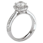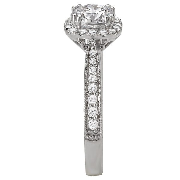 Cushion Shaped Halo Diamond Ring with Milgrain Detail in 14kt White Gold (D. 1/3 carat total weight) This item is a SEMI-MOUNT and it comes with NO CENTER STONE as shown but it will accommodate a 6.5mm round center stone. This Ring Requires a Curved Matching Band, #117221-WK, Sold Separately.