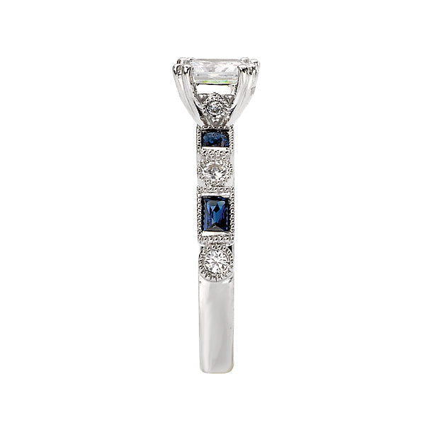 Sapphire and Diamond Ring Set in 14kt White Gold. (D 1/8 carat weight, Sapp 1/2 carat weight) This item is a SEMI-MOUNT and it comes with NO CENTER STONE as shown but it will accommodate a 5.5mm princess cut center stone. Peg Head
