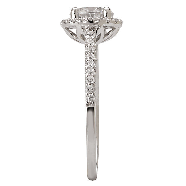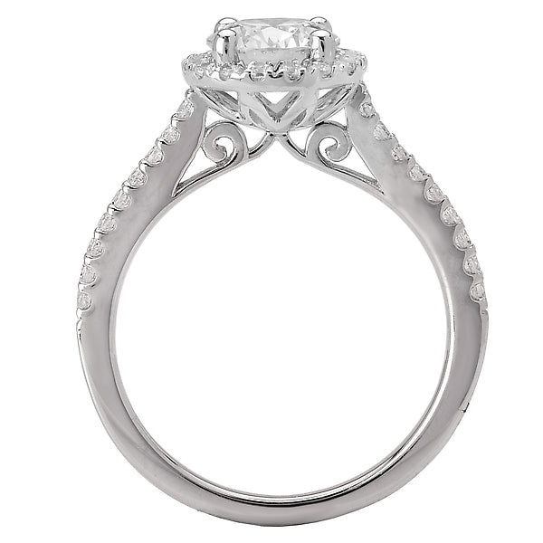Round Halo Diamond Engagement Ring in 14kt White Gold. (D 1/4 carat total weight) This item is a SEMI-MOUNT and it comes with NO CENTER STONE but it will accommodate a 6.5mm round center stone.