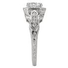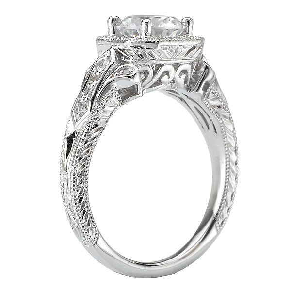 This 14kt white gold semi-mount ring has beautiful engraving and milgrain designs with an octagon shaped halo that surrounds a center setting that will accommodate a 6.5mm round diamond. (D 1/5 carat total weight)