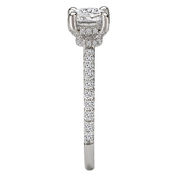 This is a semi-mount 14kt white gold engagement ring with sparkling round diamonds along the band on either side of a center setting that will accommodate a 6.5mm round diamond. (D 1/3 carat total weight)