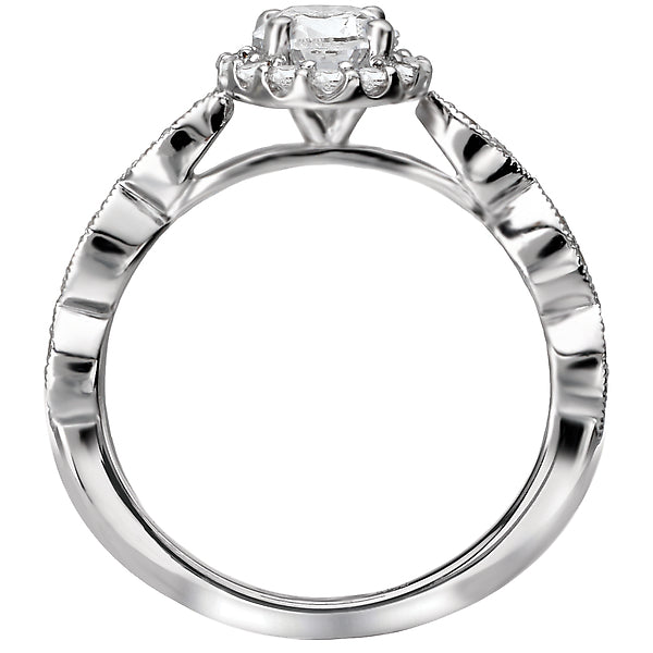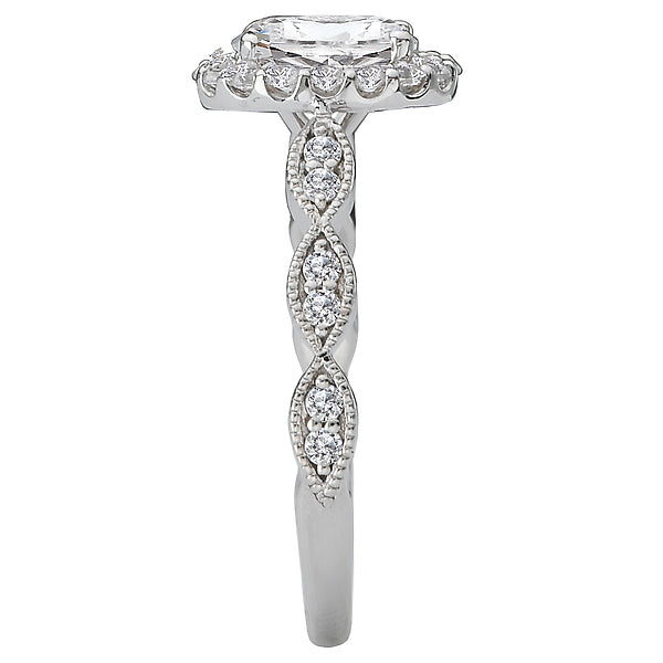 Oval shaped halo diamond ring in 14kt white gold with milgrain detail. (D 1/3 carat total weight) This item is a SEMI-MOUNT and it comes with NO CENTER STONE as shown but it will accommodate a 7.5x5.5mm oval center stone.