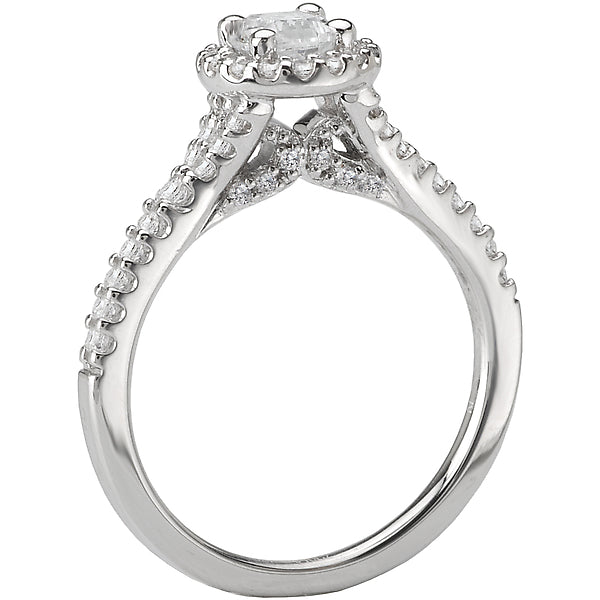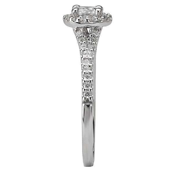 This 14kt white gold engagement ring has diamonds along the shank on either side of a round halo that surrounds a center setting that will accommodate a 4.8mm round diamond. (D 1/3 carat total weight)