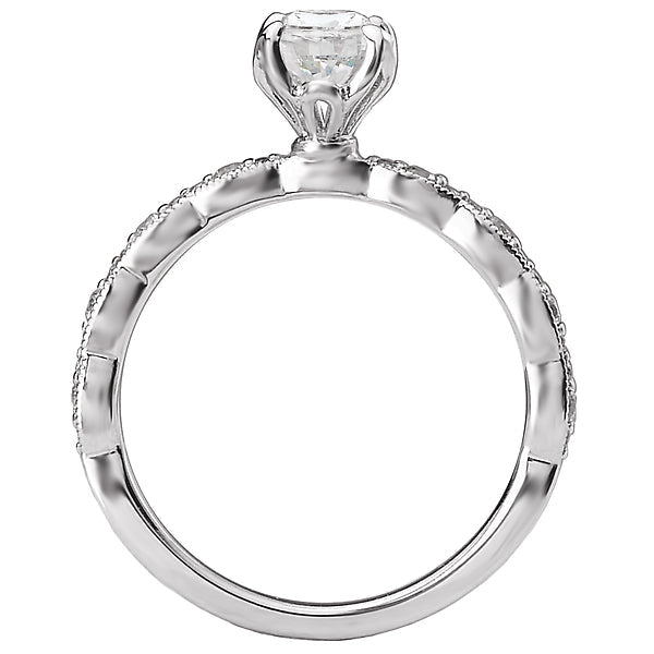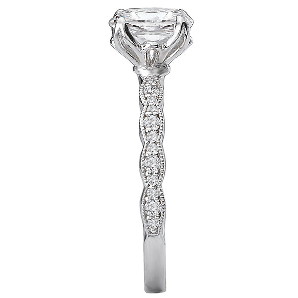 This elegant ring features a scalloped shank lined with milgrain and sparkling round diamonds surrounding the fancy peg head setting created in high polished 14k white gold. (D 1/6 carat total weight) This ring is a SEMI-MOUNT and it comes with NO CENTER STONE as shown but it will accommodate a 7.5x5.5mm oval center stone.