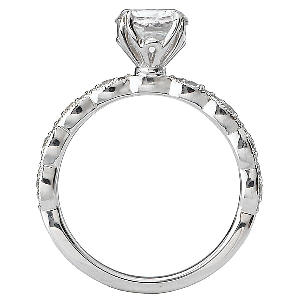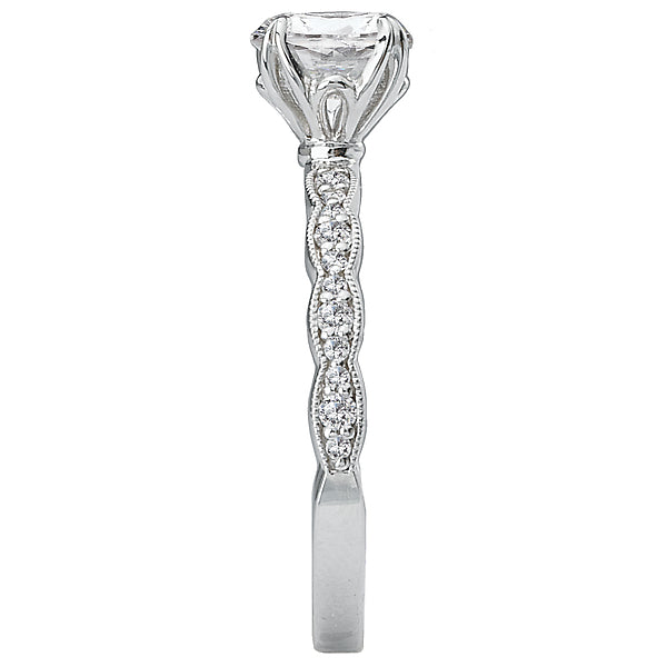 This elegant ring features a scalloped shank lined with milgrain and sparkling round diamonds surrounding the fancy peg head setting created in high polished 14k white gold. (D 1/6 carat total weight) This ring is a SEMI-MOUNT and it comes with NO CENTER STONE as shown but it will accommodate a 6.5mm round center stone.