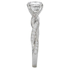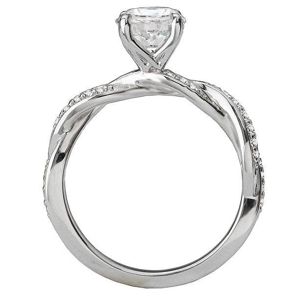 This gorgeous bridal ring with a peg head setting will accommodate a round 6.5mm center stone and showcases a braided shank lined with sparkling round diamonds set in high polished 14k white gold. (D 1/6 carat total weight)