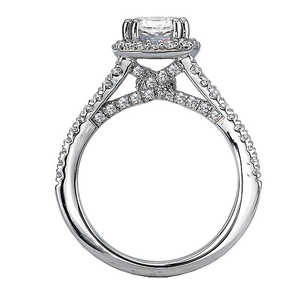 This is an elegant semi-mount ring created in 14k white gold that features round faceted diamonds wrapping around the center stone and lining the split shank. (D 5/8 carat total weight) This ring is a SEMI-MOUNT and it comes with NO CENTER STONE as shown but it will accommodate a 6.5mm round center stone.