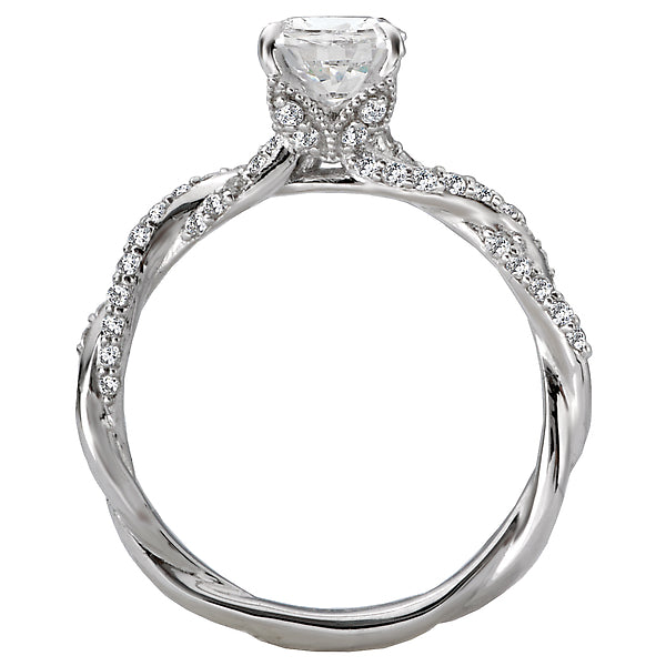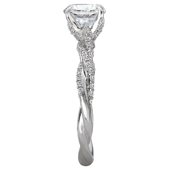 This high polished 14kt white gold ring showcases a plethora of round sparkling diamonds lining the twisted shank that surrounds the center setting. (D 1/4 carat total weight) This ring is a SEMI-MOUNT and it comes with NO CENTER STONE as shown but it will accommodate a 6.5mm round center stone.