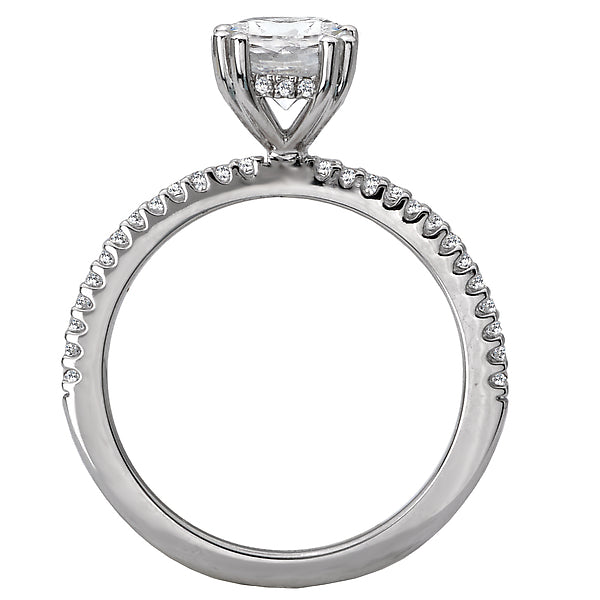This elegant bridal ring showcases brilliant cut diamonds set in high polished 14kt white gold surrounding the center setting that will accommodate a round 6.5mm setting. (D 1/6 carat total weight)