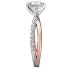 Dazzling engagement ring created in high polished 14kt white and rose gold showcases brilliant cut diamonds aligning the criss cross shank surrounding the center stone setting that will accommodate a round 6.5mm diamond or gemstone. (D 1/5 carat total weight)