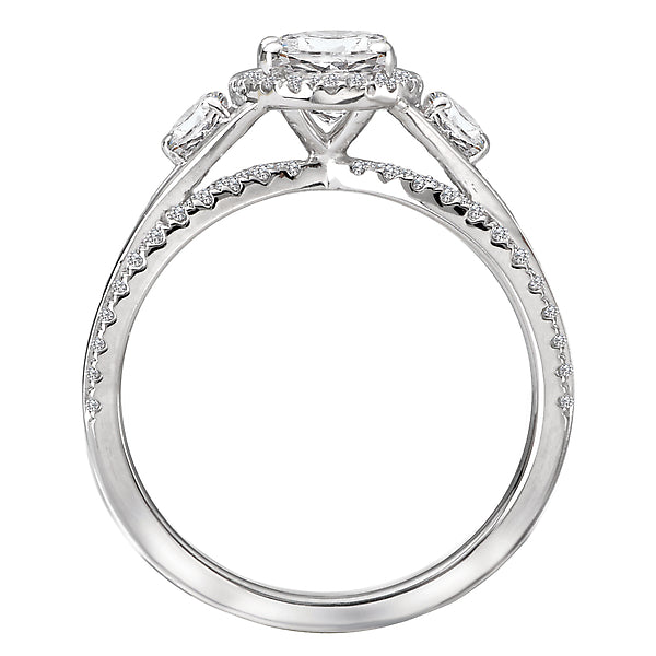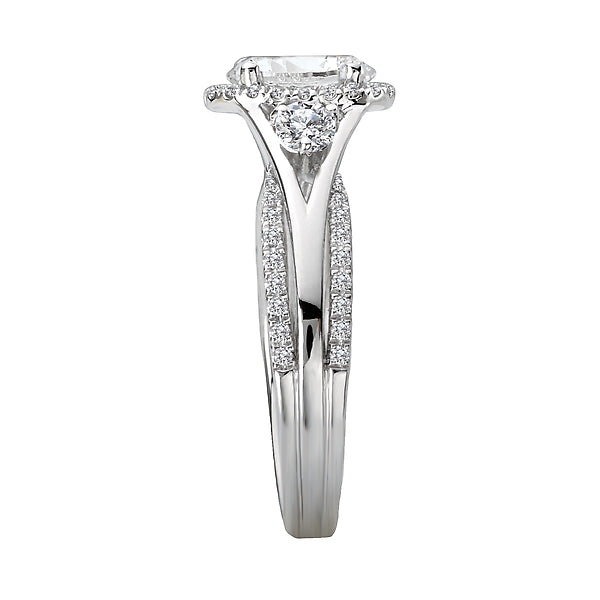 This diamond ring features intertwined shanks lined with brilliant cut diamonds, set in high polished 14kt white gold. A beautiful halo and two additional round diamonds surround the center setting that will accommodate an oval 7.5x5.5mm center. (D 1/2 carat total weight)