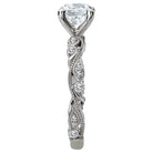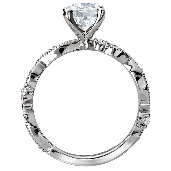 Elegant engagement ring features leaf designs and milgrain accents. The sparkling diamonds are set in 14kt high polished white gold. (D 1/5 carat total weight) This SEMI-MOUNT ring comes with NO CENTER STONE but it will accommodate a 6.5mm round center.