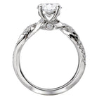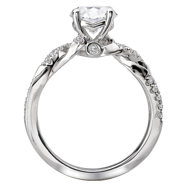Gorgeous engagement ring crafted in high polished 14kt white gold is embellished with brilliant cut diamonds aligning the shank in an open twist. The center setting will accommodate a 6.5mm diamond. (D 1/6 carat total weight)