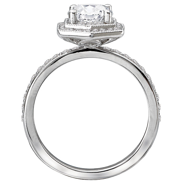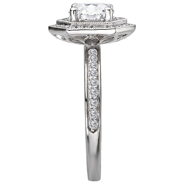 Crafted in high polished 14kt white gold, this bridal ring showcases a stunning hexagon shaped halo with brilliant cut diamonds surrounding the center setting that will accommodate a 7.5x5.5mm oval diamond. (D 3/8 carat weight total)