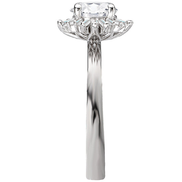 This semi-mount sparkling beauty features a halo of round and baguette diamonds, set in 14kt white gold, surrounding a center setting that will accomadate a 6.5mm round diamond. (D 1/5 ctw)