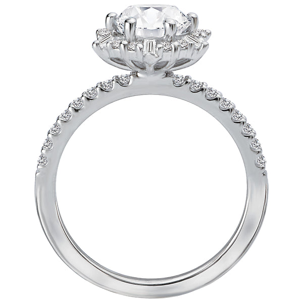 Lots of sparkling diamonds on this beautiful semi-mount engagement ring lining the shank and the halo. Round and baguette shapped diamonds are set in 14kt white gold which surround the center setting that will accommodate a 6.5mm round diamond. (D 3/8 carat total weight)