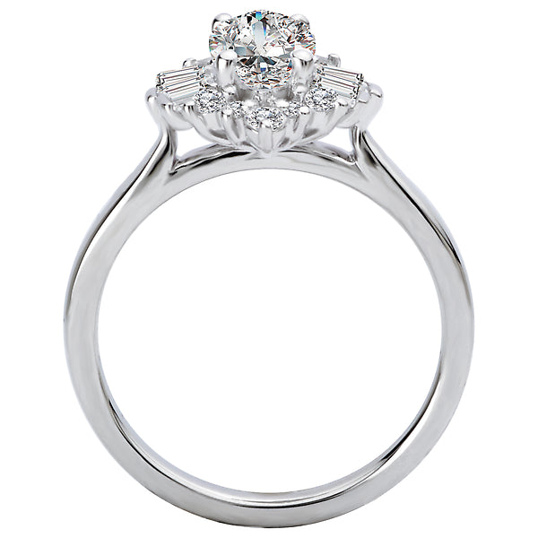 This stunning semi-mount engagement ring has a halo of sparkling baguette diamonds set in high polish 14kt white gold. The center setting will accommodate a 10x5mm marquise cust diamond. (D 3/8 carat total weight)