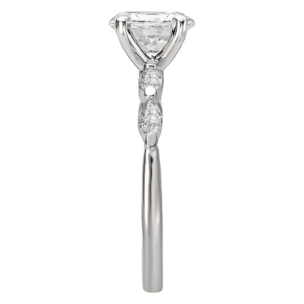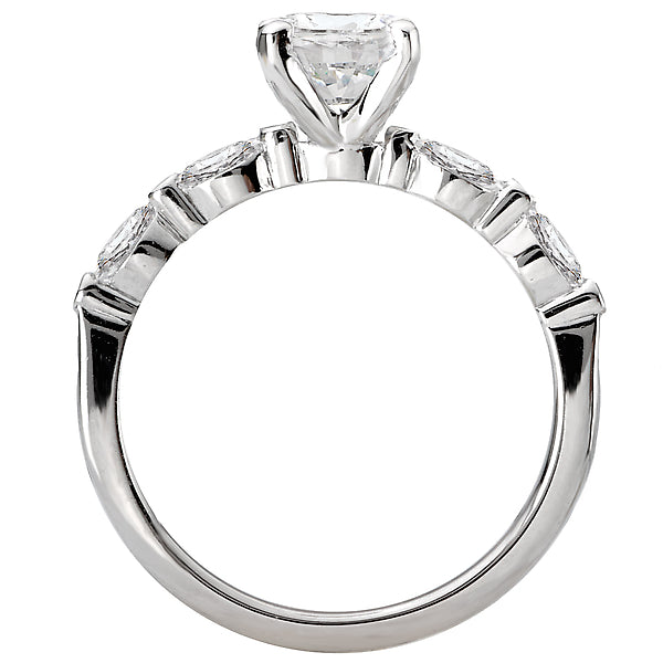 Dazzling engagement ring created in high polished 14kt white gold showcases marquise sparkling diamonds surrounding the center setting that will accommodate an 7.5x5.5mm oval diamond. (D 1/4 carat total weight)