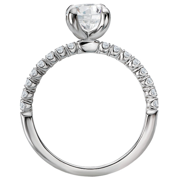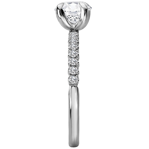 This 14kt white gold semi-mount engagment ring has round micro set diamonds aligning the shank on both sides of a setting that will accommodate a 6.5mm round diamond. (D 1/4 carat total weight)