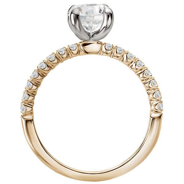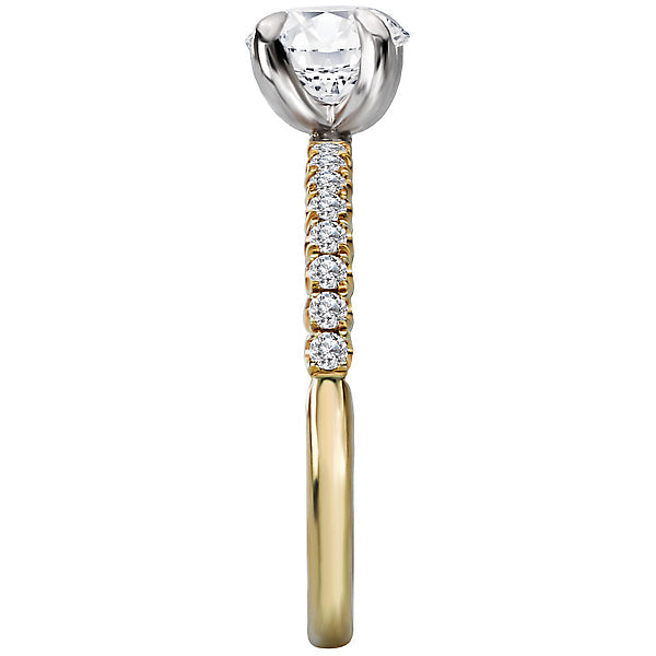 This 14kt yellow gol- semi mount engagment ring has round micro set aligning the shank on both sides of a setting that will accommodate a 6.5mm round diamond. (D 1/4 carat total weight)