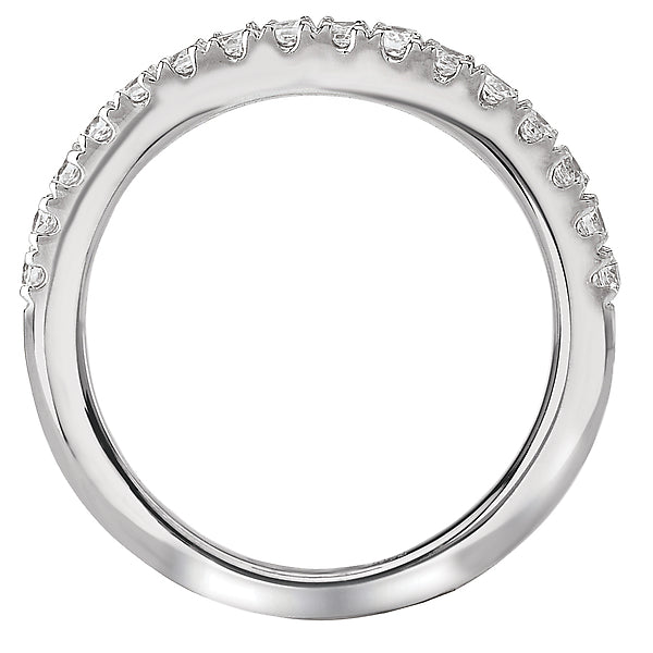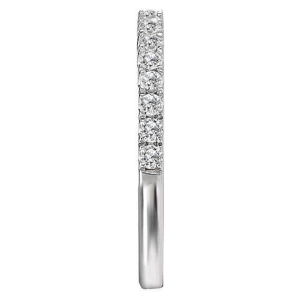 This is a matching wedding band with round faceted diamonds set in 14kt white gold. (D 1/7 carat total weight)