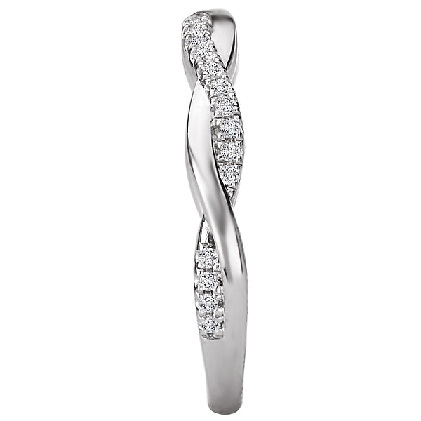 Twisting 14kt white gold lined with sparkling diamonds is featured on this matching wedding band. (D1/7 carat total weight)