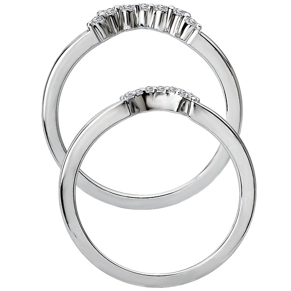 This nesting wedding band with guard is encrusted with marquise and round diamonds along curves that will surround a round cut solitare diamond. All set in high polished 14kt white gold. (D 1/4 carat total weight)