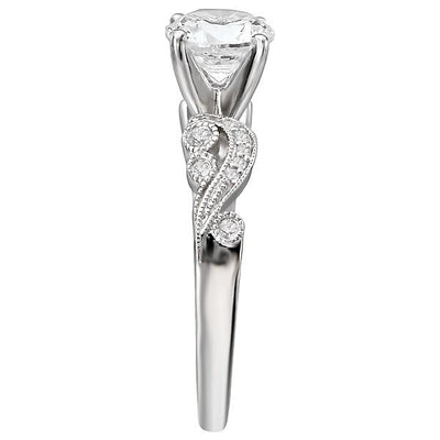 Diamond engagement ring with a swirled design is crafted in 14kt white gold with milgrain detail around the peg head center. (D 1/10 carat total weight) This setting SEMI-MOUNT ring comes with NO CENTER STONE as shown but it will accommodate a 6.5mm round center.